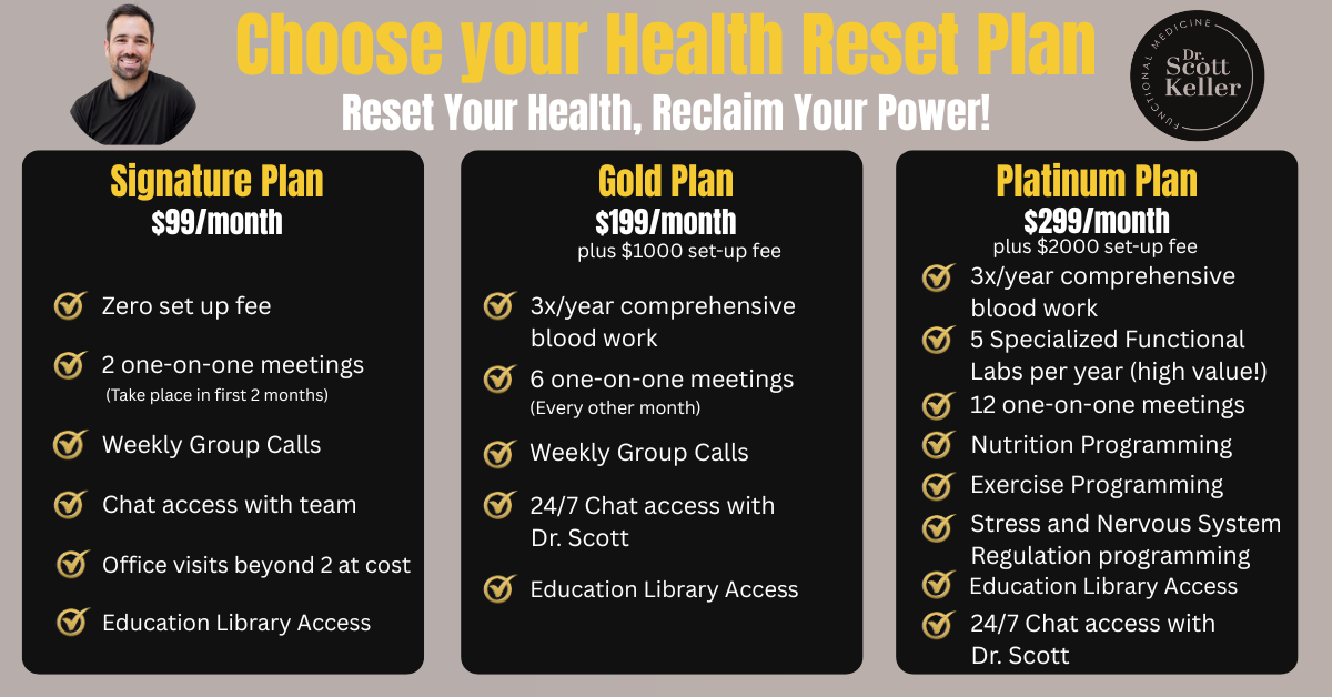 Ready to go deeper? The Gold Plan gives you comprehensive blood work three times per year, one-on-one meetings every other month, weekly group calls, and 24/7 chat access directly with Dr. Scott.